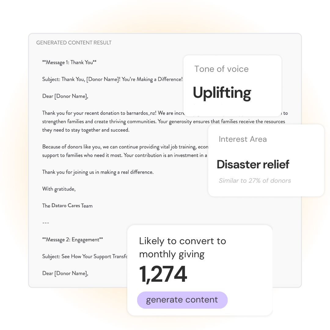 Identify each donor's top interests and motivators, based on the emails that they interact with, and instantly generate appeal copy tailored directly to them. ChatGPT doesn't know your donors, but Dataro does.