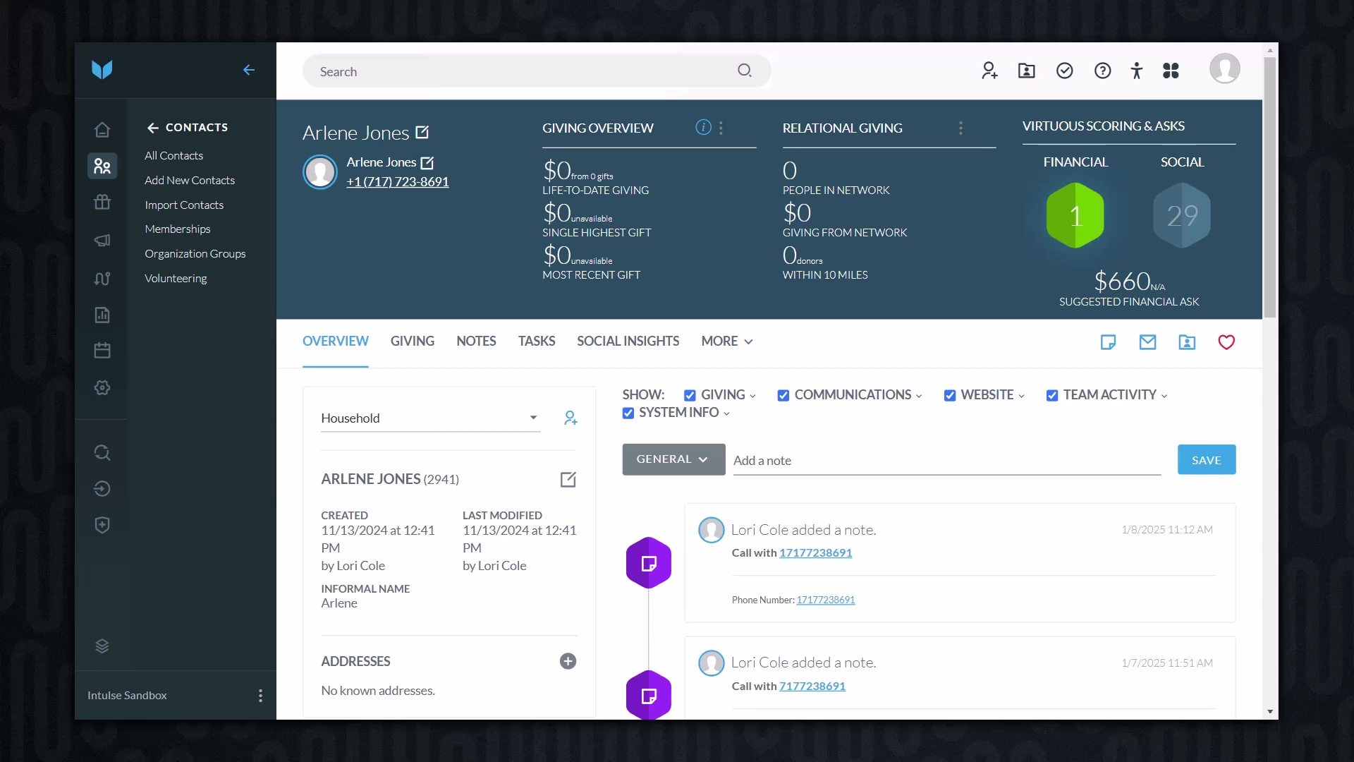 - Have every phone interaction auto-logged as a note in that contact’s record in Virtuous CRM