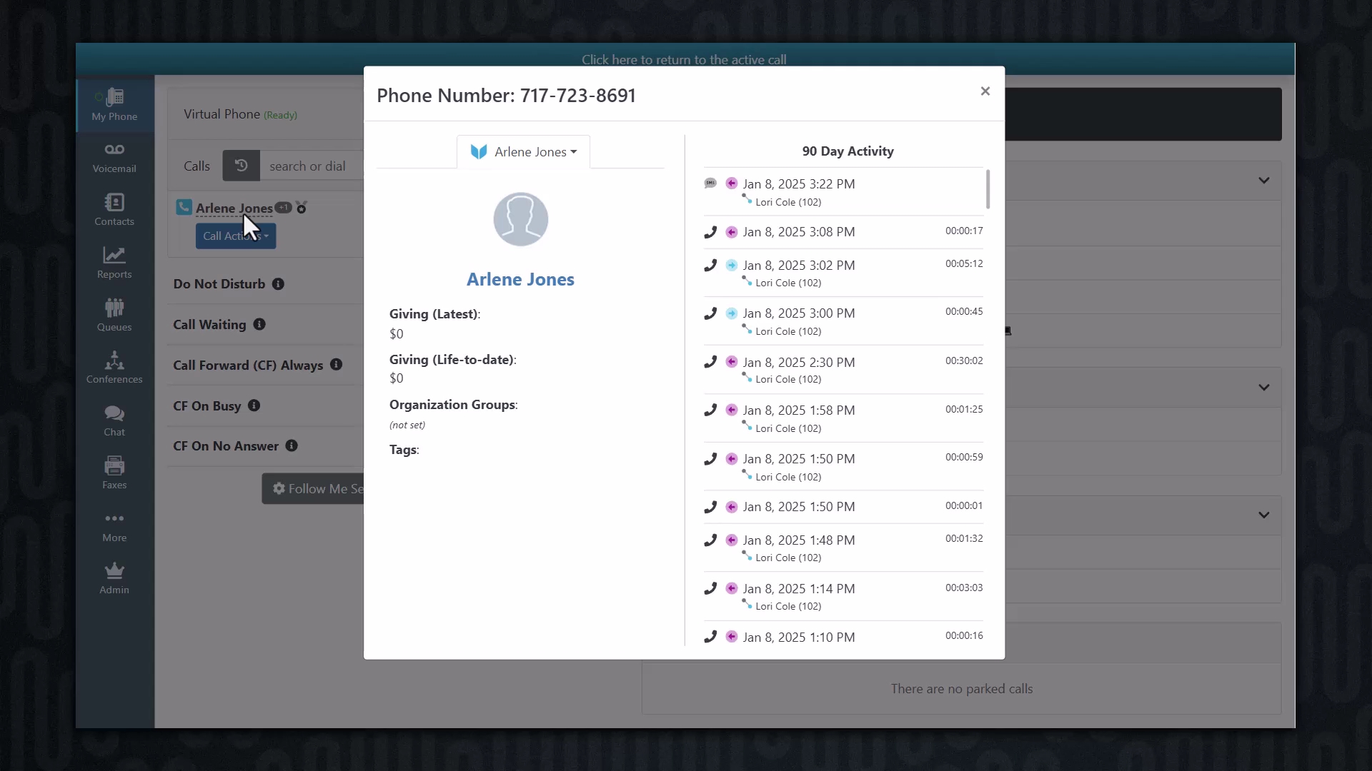 - Alerts provide detail on who is calling and offer a direct link to that record in Virtuous CRM