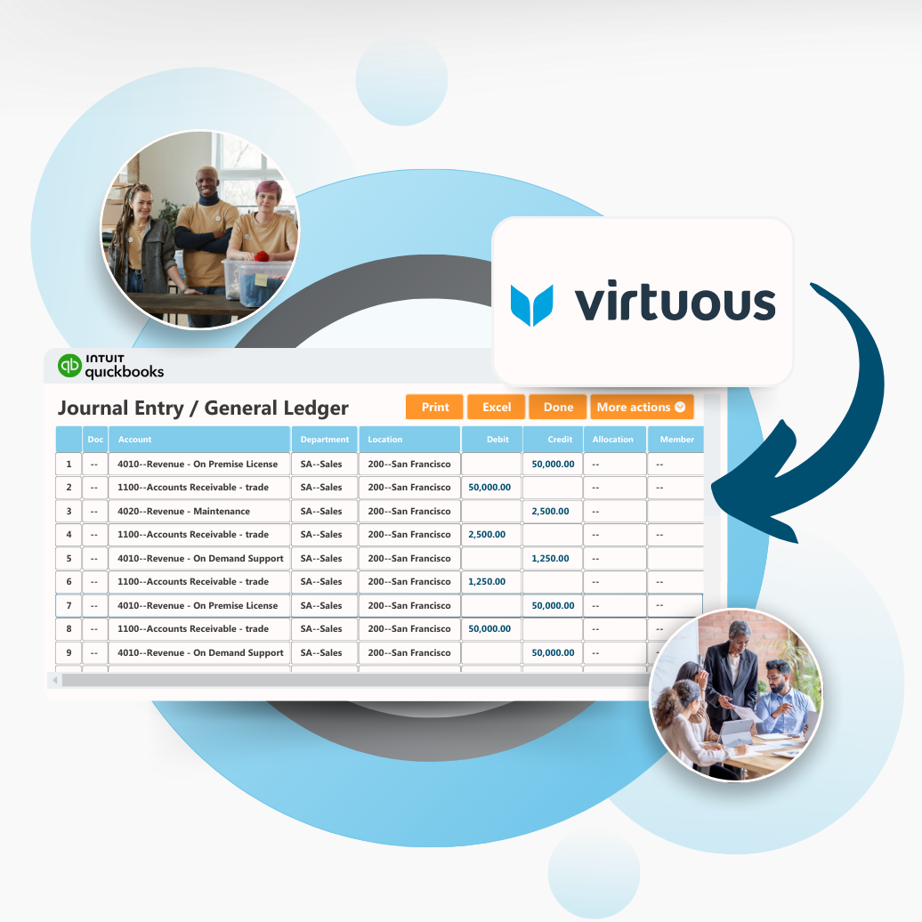 Eliminates time-consuming tasks by pulling transactional data Virtuous, standardizing it, and sending it to the general ledger. Enable timely financial statements, faster month end and year-end close, and confident reporting to auditors, board members, and supporters.